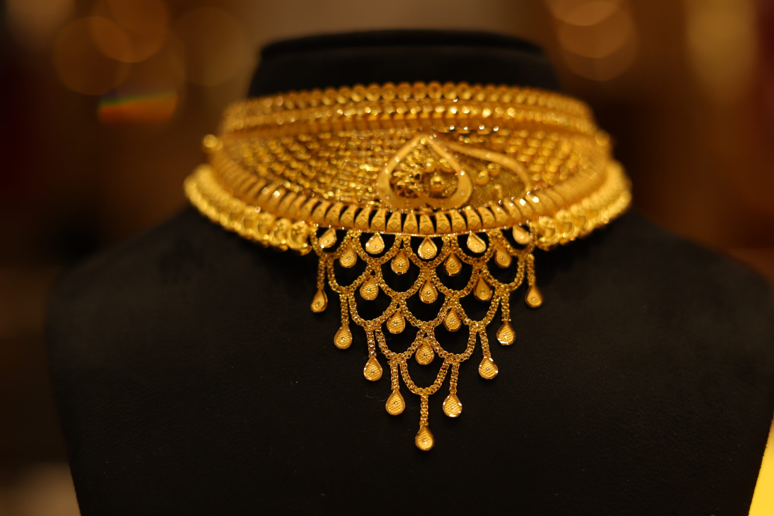 A stunning gold-plated choker necklace featuring an intricate mesh-like pattern with meticulous detailing, and adorned with a bold, beautiful heart-shaped centre design and tiered layers of elegant gold drop danglers. Highly suited for bridal ensembles, grand weddings, and festive celebrations. This exquisite piece is beautiful statement of timeless beauty that you can treasure for a long time.