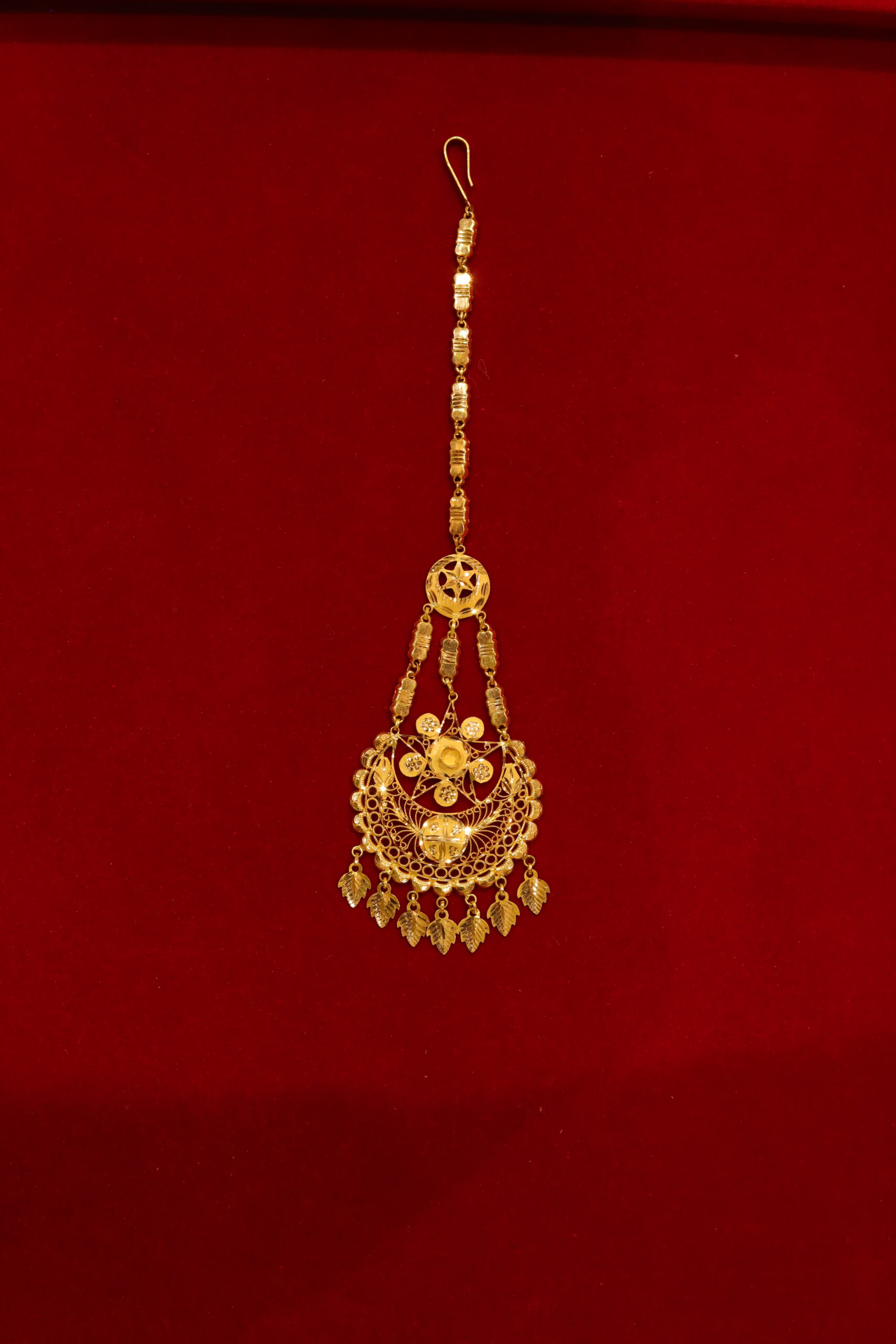 Festive wear maang tikka with an intricate design featuring a central floral and crescent-shaped pendant and dangling leaf-like tassels. This traditional Indian ornament adds a luxe gilded look to your festive or wedding attire.