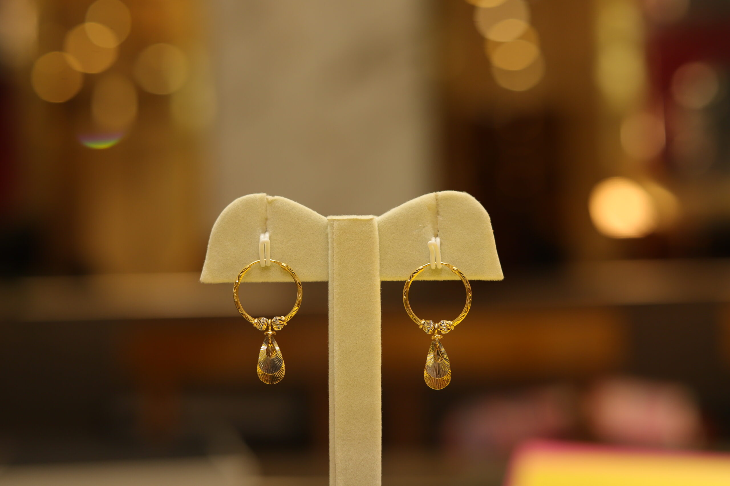 Textured circular and teardrop-shaped gold dangler earrings for the urban woman. This trending pair of hoop earrings speaks volumes with its contemporary aesthetic design and is a beautiful symbol of simple elegance. Goes perfectly with workwear, festive looks, and party attire.