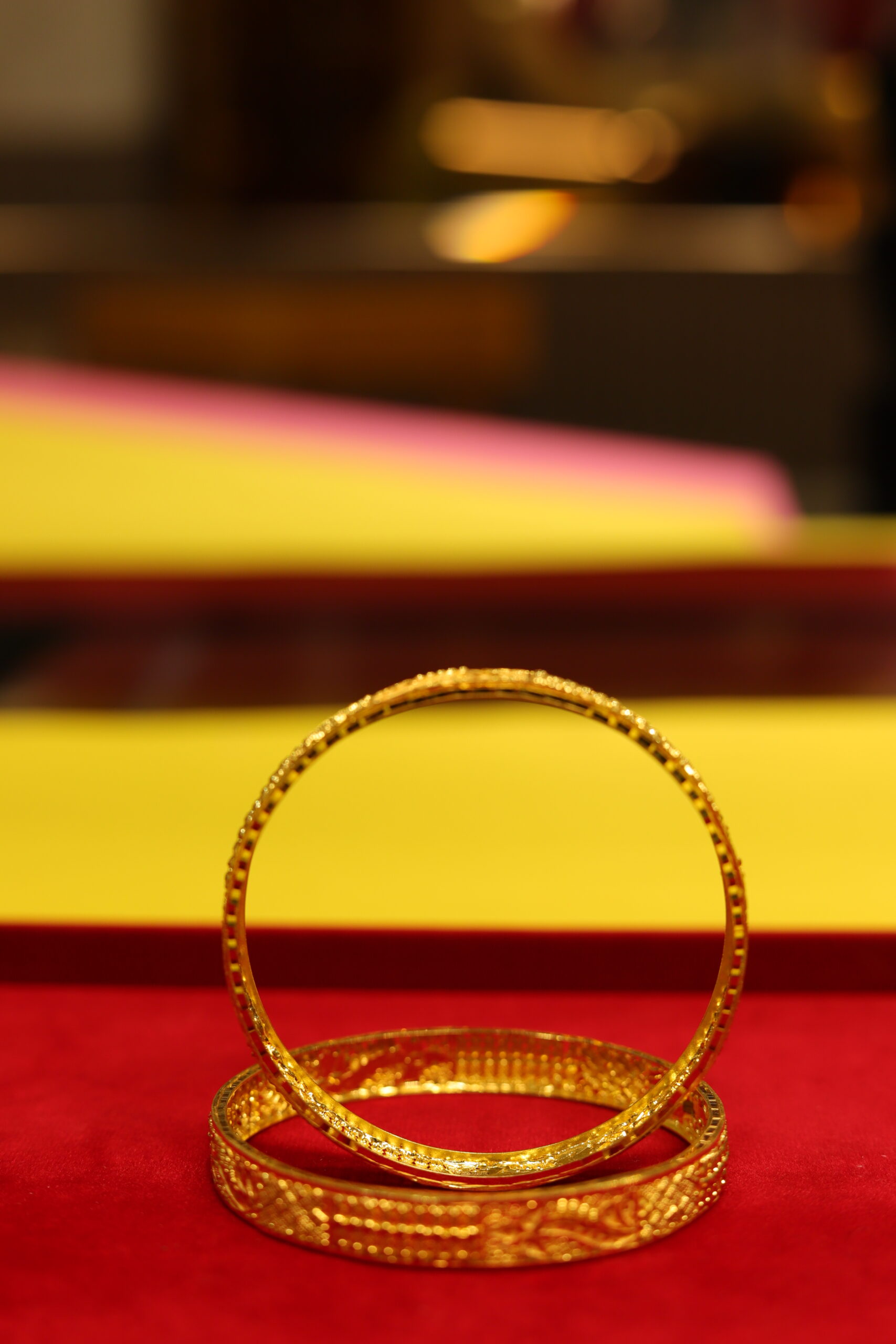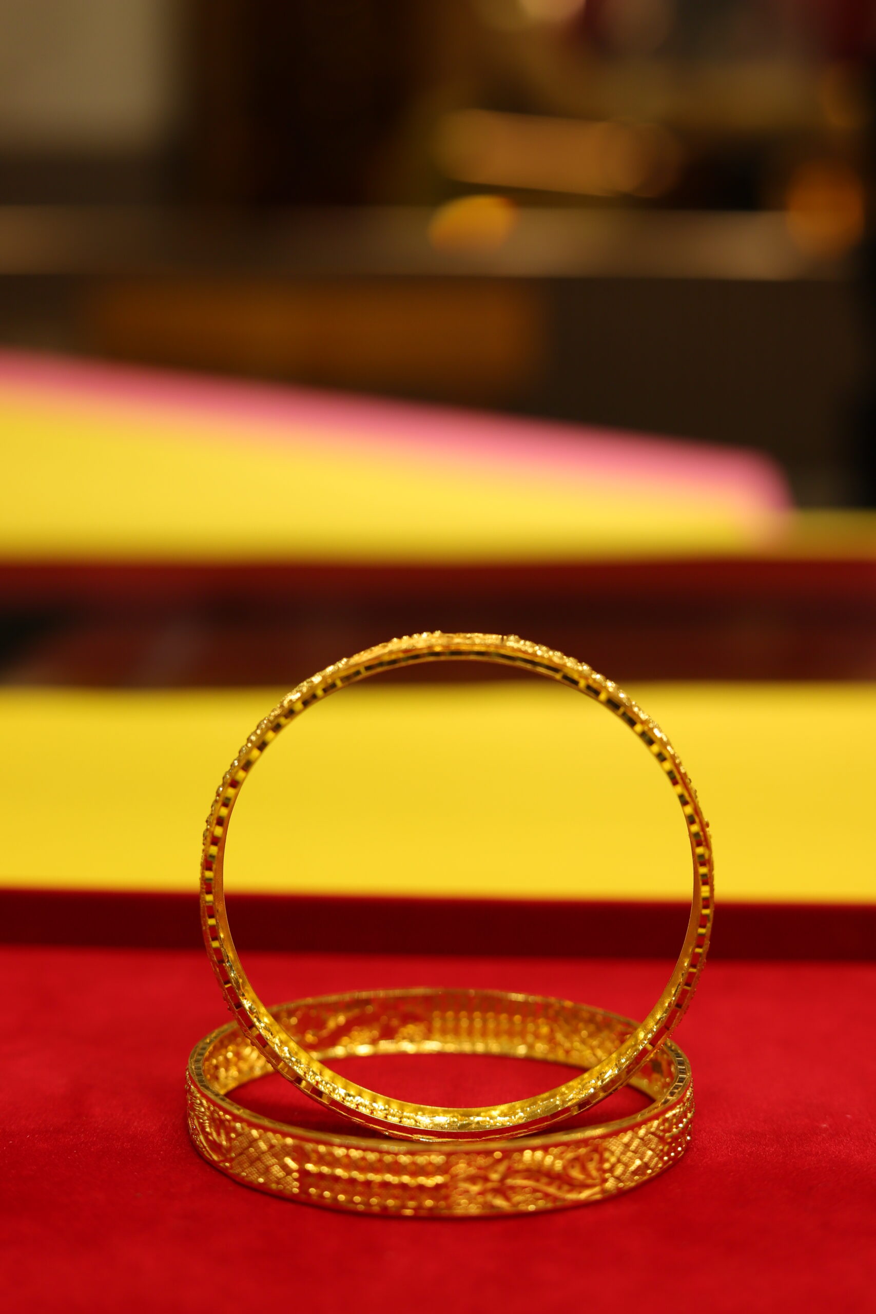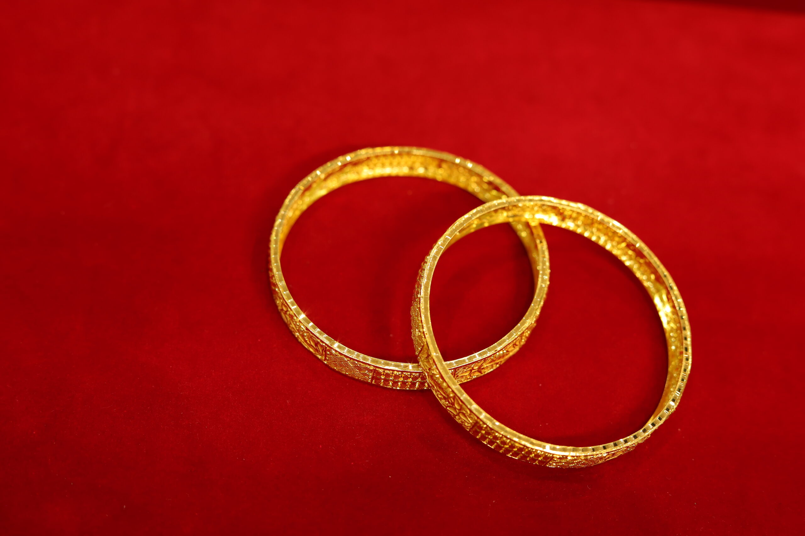 Traditional ‘kada’ or ‘chur’ inspired bangles with intricate ornate detailing etched on them. These beautifully crafted gold-toned bangles feature a warm golden lustre and a blend of contemporary and antique charm, adding a subtle touch of sophistication to your ensemble. A timeless adornment for women and girls, these golden bangles are a great addition to your jewellery collection.