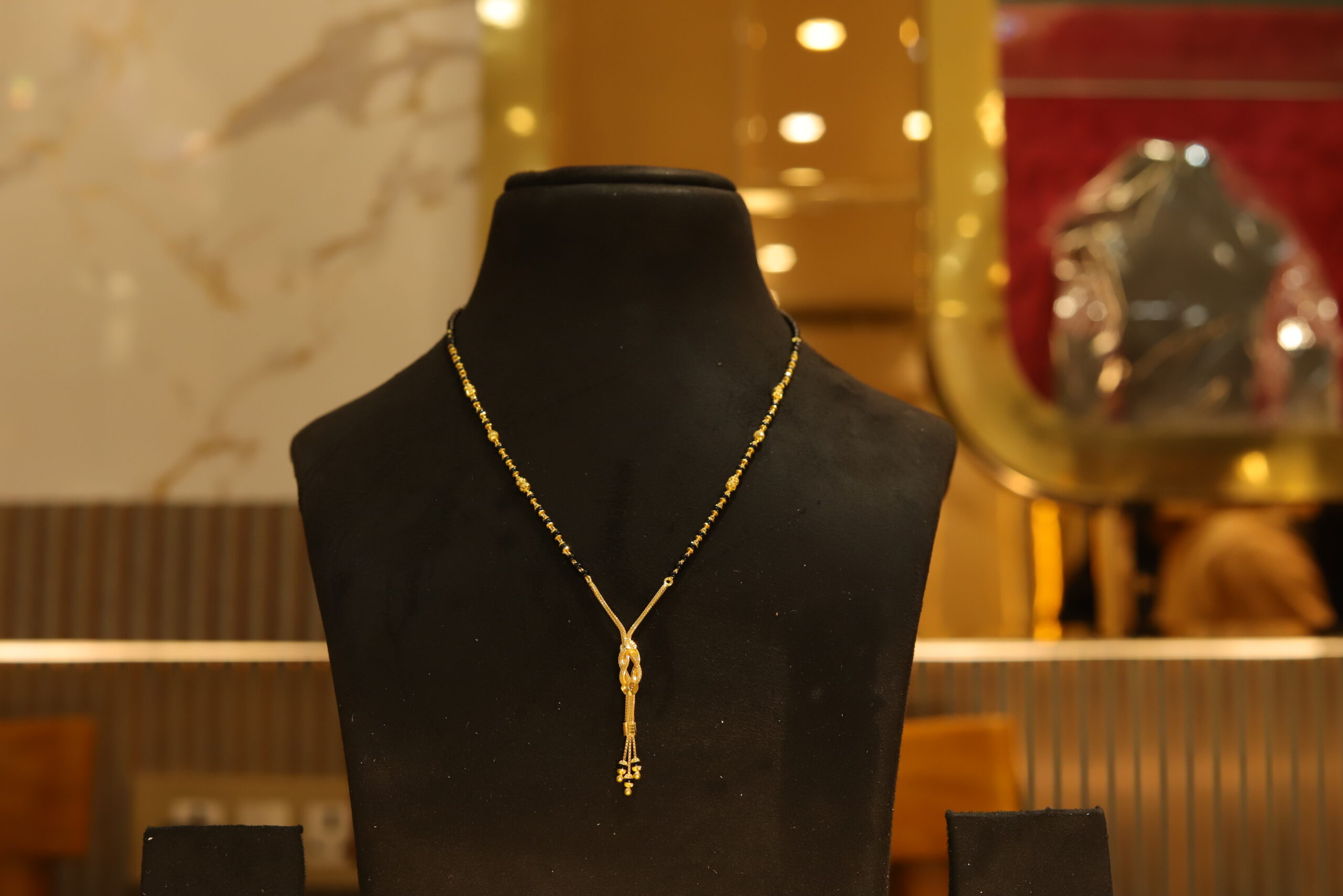 Elegant and minimalist, this single-strand black and gold beaded mangalsutra features a charming knot-patterned golden pendant with delicate danglers. A beautiful symbol of love for married women, this chic mangalsutra necklace is the perfect accessory for parties, family events, and casual gatherings. Suitable for daily use or occasional wear.