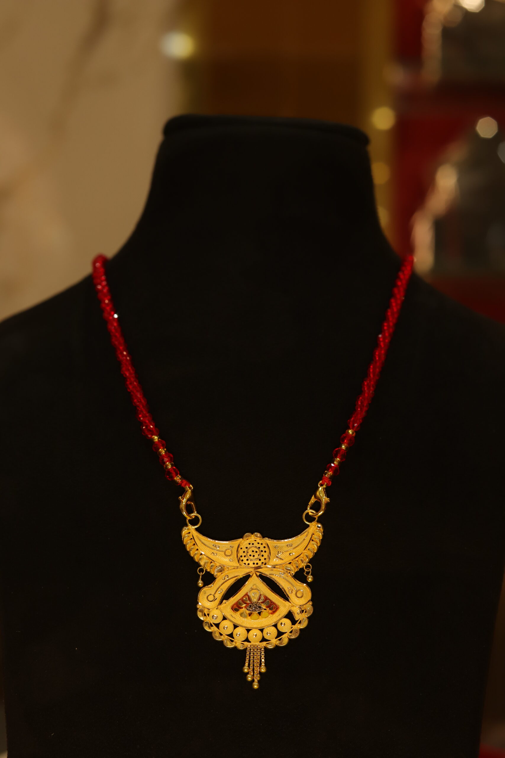 Embrace the beauty of India’s rich heritage with this designer, gold-plated mangalsutra. The mangalsutra necklace features an intricate golden pendant with a classic Indian motif and a vibrant red beaded chain, and is finished with a high-quality gold polish.