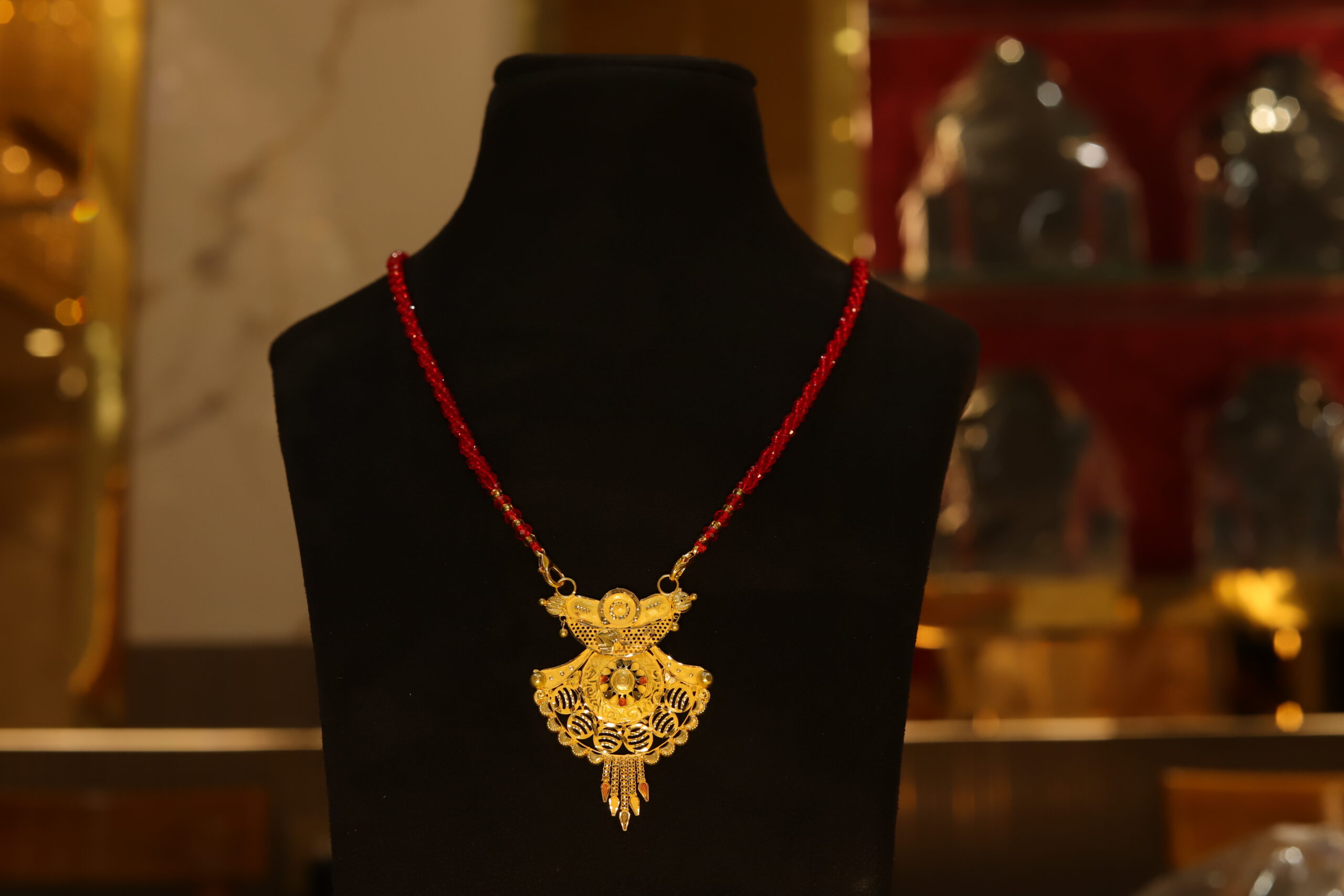 Beautifully designed traditional Indian mangalsutra that goes perfectly with all Indian attire. The necklace features a classic ethnic pattern with a thick red beaded strand, an ornate, peacock inspired golden pendant with intricate filigree work, artificial crystal beads, and dangling tassels.