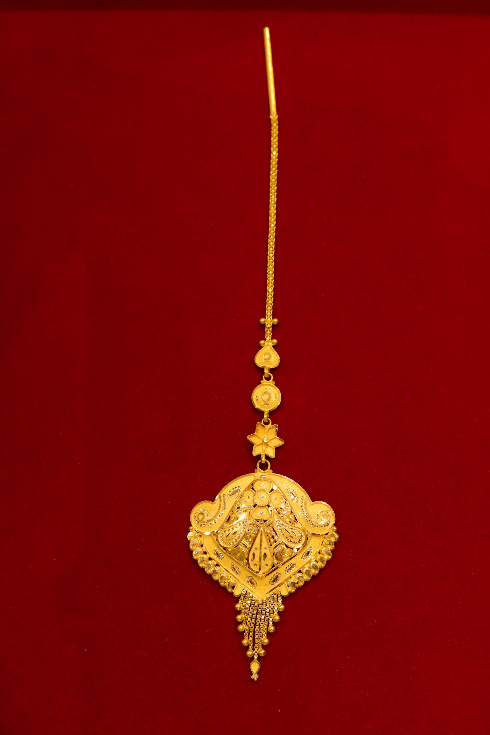 Premium gold-plated fancy maang tikka for ladies featuring a temple-inspired design consisting of a central pendant, exceptional detailing, and fine filigree work with delicate hanging elements. Beautifully crafted to bring out the natural brilliance of real gold, this maang tikka adds a rich, luxurious feel to your traditional look. Perfect for wearing in weddings, engagements, or festivals.
