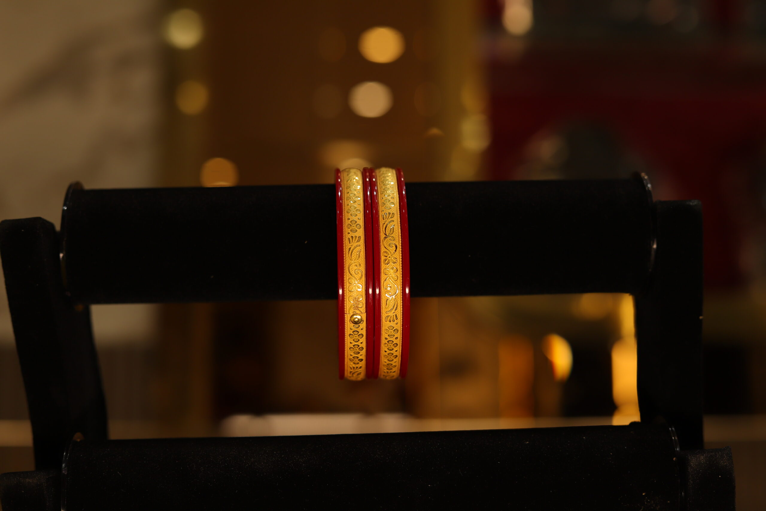 A traditional Bengali jewellery for married women, these elegant gold-plated red pola bangles or ‘shanka pola’ bangles are a symbol of grace and heritage. A mix of pure tradition and modern chic designs, these bangles can be worn to jazz up your daily look or paired with a set of gold bangles for a more festive feel.