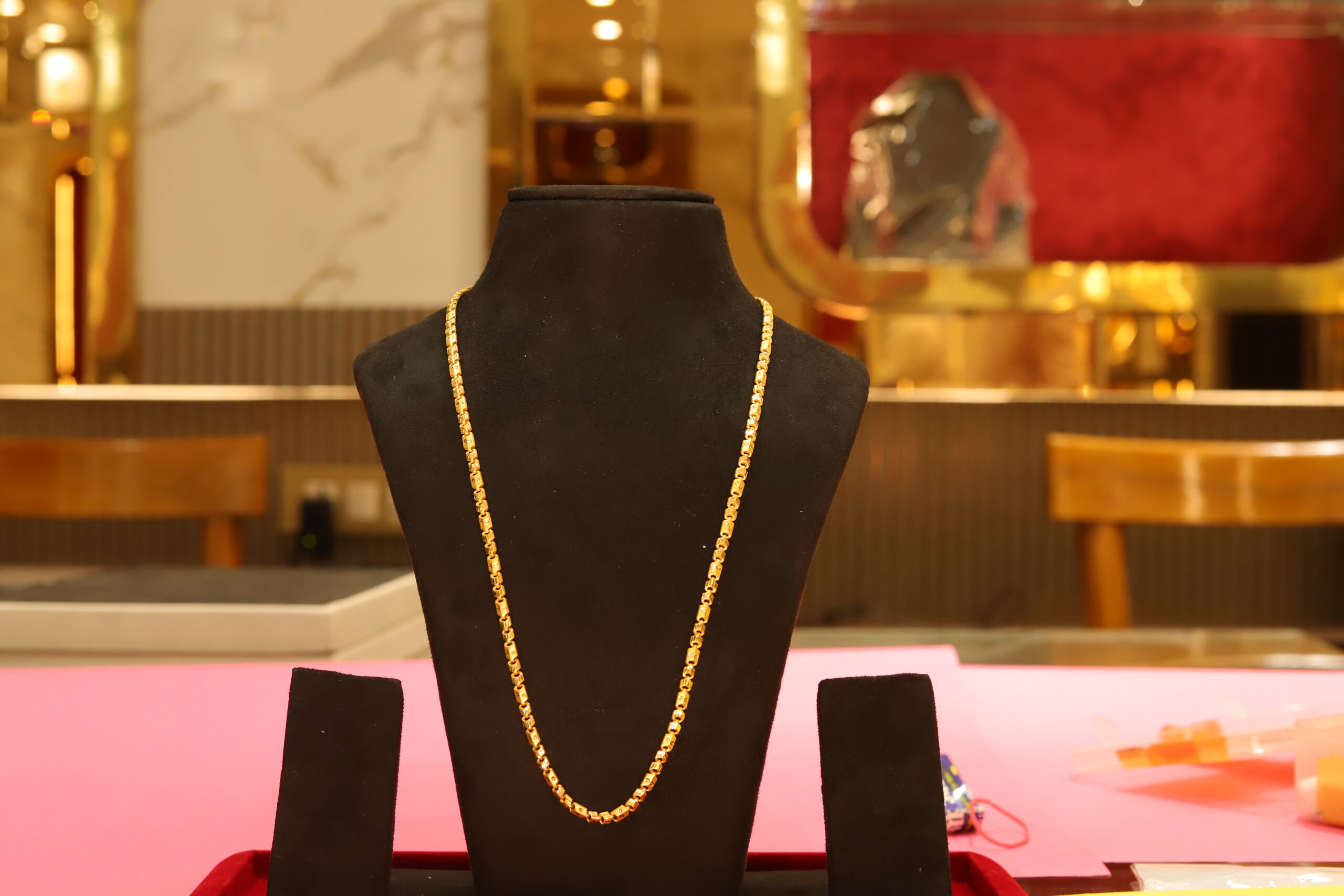 Box-style imitation gold chain for men and women featuring a traditional Indian design of interlocking geometric patterns. The chain is of medium thickness and can be used for both daily wear and special occasions.
